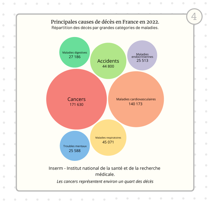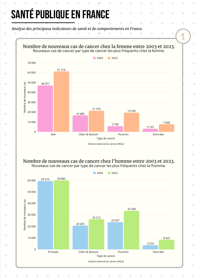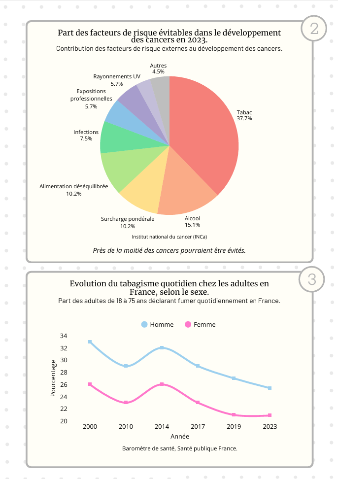 J’ai travaillé sur plusieurs thématiques : l’évolution du nombre de cancers chez les hommes et les femmes, l’évolution du tabagisme, les causes évitables du cancer ainsi que les principales causes de décès en France. Toutes ces recherches et ces visuels m’ont permis d’observer une corrélation entre toutes ces thématiques et d’en tirer des conclusions.